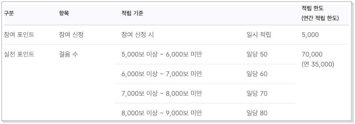 - 예시: 월 20일 이상 7,000보 달성 시 해당 월 포인트 제공 (구체 포인트는 시기 및 운영지침에 따라 변경될 수 있음)