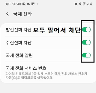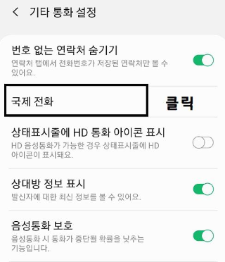4. 그다음 여러가지 설정을 할수 있는 문구들이 나오는데요. 저희는 지금 국제전화를 수신차단하기 위한것이니 국제전화를 클릭하여 줍니다.